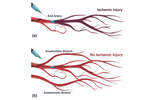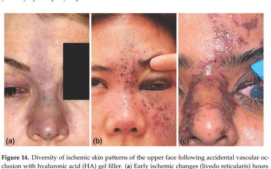 Quando un embolo di HA ostruisce il flusso sanguigno, si può potenzialmente avere anossia tissu-tale, ischemia che può progredire fino alla necrosi. Il filler può migrare sia per via anterograda che retrograda lungo l'albero arterioso. Quando si osservano cambiamenti di colore della pelle (bianco, marmorizzato, blu-grigio), il sospetto di compromissione vascolare dovrebbe aumentare. Un immediato sbiancamento seguito dalla marmorizzazione (livedo reticularis) di solito si verifica entro poche ore dall'iniezione a causa della mancanza di ossigeno con conseguente dilatazione venosa. Dopo la fase livedo reticularis, segue la fase blu-grigio, a causa della persistente mancanza di ossigeno. Infine, 1-2 giorni dopo, segue la fase delle vescicole (pustole) che è uno dei primi segni di necrosi cutanea.