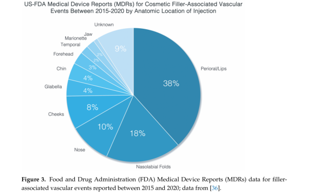 Qui di seguito viene ripotata una schematica rappresentazione delle complicanze ischemiche più frequenti. Si vede come le labbra e le ruga naso geniena siano le più coinvolte, probabiemente perchè sono tra le richeste più frequenti e la condizione vasscolare è tra le più delicate.