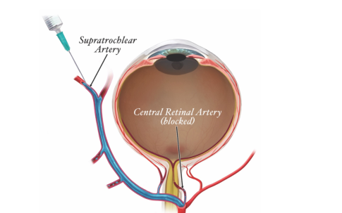 Gli oftalmologi raccomandano di iniettare la ialuronidasi nello spazio retrobulbare solo quando il paziente non ha percezione della luce (NLP) o quando il paziente non vede alcun movimento della mano. Se il paziente può ancora contare le dita, non è consigliabile l'iniezione retrobulbare. La diagnosi differenziale di perdita visiva acuta, anche se molto improbabile, include l'aura dell'emicrania e un ictus non correlato all'iniezione. Dopo l'iniezione di ialuronidasi e durante il trasporto in ospedale, il massaggio oculare deve essere continuato nel tentativo di spingere l'embolia attraverso i vasi capillari retinici nel sistema venoso e di ridurre la pressione intra oculare. Altre terapie per migliorare la perfusione retinica descritte in letteratura (anche se con successo limitato) possono essere prese in considerazione sono: la terapia iperbarica immediata/ossigeno, diuretici, corticosteroidi sistemici e topici, anticoagulanti e decompressione con ago della camera anteriore.