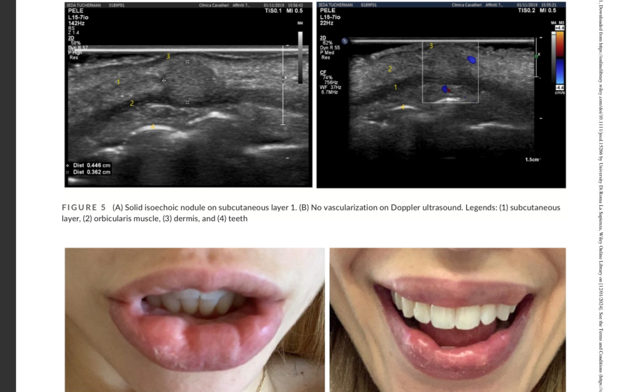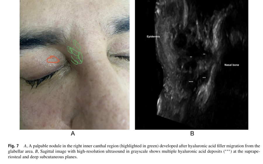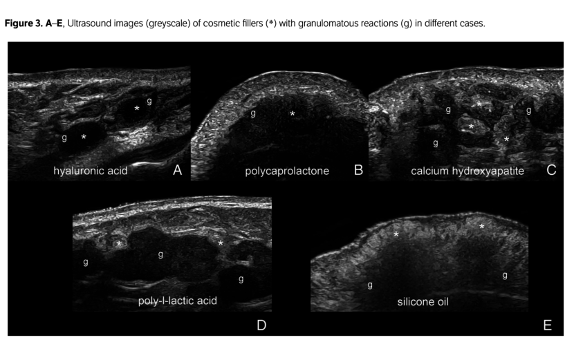 Oggigiorno, l'ecografia ad alta frequenza (≥15 MHz) presenta una risoluzione spaziale assiale più elevata rispetto alla risonanza magnetica e può fornire informazioni anatomiche dettagliate sul tipo, la posizione dello strato tissutale e le dimensioni dei depositi, nonché rilevare la presenza di segni di infiammazione e i principali vasi nella regione. Possiamo avere pattern ecografici non legati al filler che si presenta come un nodulo ipoecogeno, pseudonodulo o tessuto diffuso mal definito. Nel caso di reazioni granulomatose secondarie a filler, questo nodulo, pseudonodulo o tessuto interessato è adiacente o circonda le aree di deposito. Lo strato localizzato della reazione granulomatosa è più ampio del previsto e, probabilmente, ciò può essere correlato alle tecniche di iniezione, a una diffusione retrograda e/o alla distribuzione dei filler.