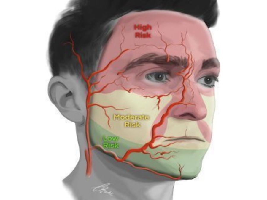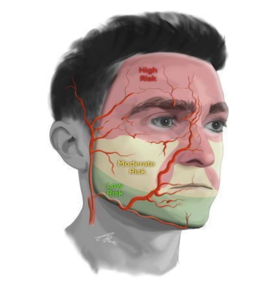 L'immagine sopra descrive le aree del viso piu a rischio durante procedure infiltrative di riempitivo. In rosso le aree più ad alto rischio, che secondo la nuova sopra indicata consensus, dovrebbero essere infiltrate "obbligatoiamente"in eco guida o al limite in ecoassistita, valutando in quest'ultima la localizzazione, il decorso e la profondità, prima di essere trattate. Mentre le aree a moderato rischio sono indicate con il colore giallo. Queste sono il Mid Face e le labbra. Infine in verde le aree a basso rischio.