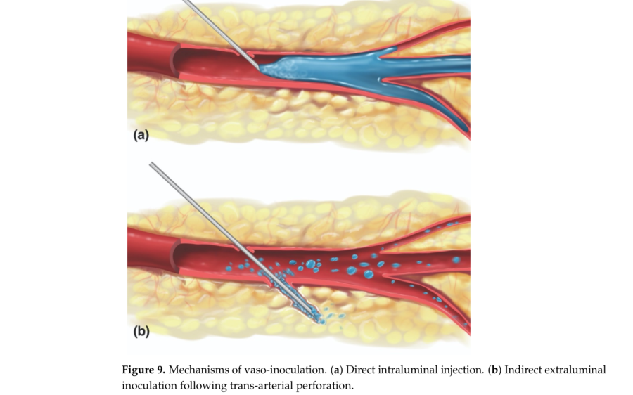 <<La figura sopra, mostra due modalità di embolizzazione delle arterie del volto con ac ialuronico.La Fig A mostra una embolizzazione diretta mentre la Fig B mostra una via indiretta attraverso il foro dell'ago. In quest'ultimo caso per far fuoriuscire il prodotto viscoso attraverso aghi piccoli, (25-30 G) occorrono pressioni molto elevate tali da far entrare il prodotto attraverso il foro di uscuta dell'arteria. inoltre l'acido ialuronico è estremamente irritante (trombogenica) per le pareti vasali occludendole con spasmi e formazioni di trombi.