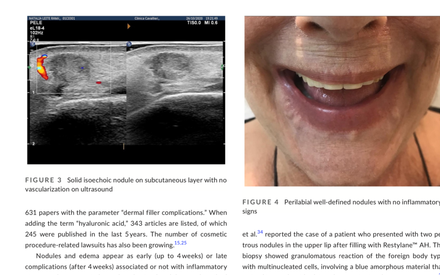L'eziologia della reazione infiammatoria ritardata indotta dai filler di acido ialuronico non si conosce pienamente. Tuttavia, le reazioni infiammatorie ritardate sono correlate a reazioni da corpo estraneo e infiammazione ricorrente attorno al filler di acido ialuronico iniettato. Pertanto, il filler iniettato deve essere il più puro possibile. Inoltre, durante l'iniezione del filler di acido ialuronico devono essere praticate rigorose tecniche asettiche. La presenza di una reazione granulomatosa può causare noduli, grumi o gonfiori indesiderati che possono peggiorare i risultati estetici dei pazienti; pertanto, la non invasiva e precoce differenziazione ecografica ha sicuramente un ruolo clinico evidente. È importante sottolineare che l'ecografia può rilevare e identificare i filler estetici più comuni, il che ha contribuito a indagare e confermare l'anamnesi dei pazienti, spesso incompleta, e a gestire le potenziali complicanze derivanti dalle iniezioni. Possiamo presumere dall'immagine ecografica la tipologia di prodotto infiltrato.