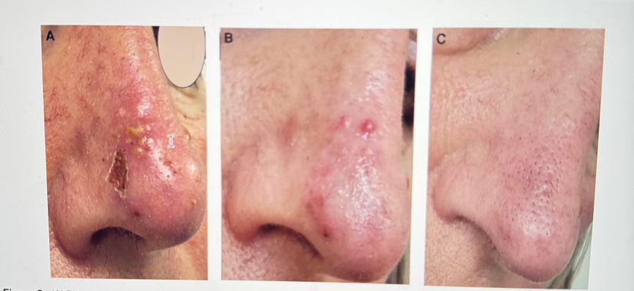 Lesione ischemica dovuta ed embolizzazione dell'arteria laterale del naso ramo dell'arteria sovratrocleare, ramo dell'arteria oftalmica. In questo caso è presente anche una compromissione del circolo carotideo interno per inversione del flusso durante la procedura infiltrativa ed embolizzazione dell'arteria retinica. La figura mostra l'evoluzione della lesione. Fig A a poche ore (livedo reticularis) Fig b a 6 h ed infine a 24 h Fig c.
