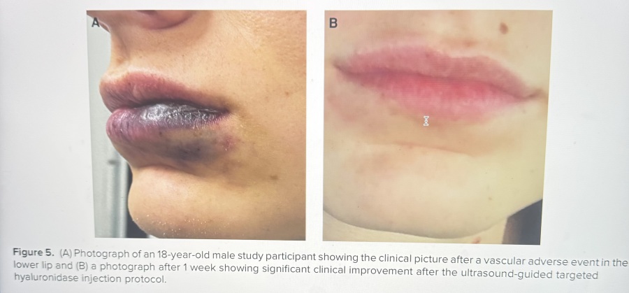 L'incidenza delle complicazioni da filler a base di HA del volto è aumentata significativamente. In questo contesto, l'ecografia, e in particolare l'ecografia Doppler, è diventata uno strumento importante per migliorare la sicurezza dei trattamenti con filler a base di acido ialuronico. L'esame ecografico può aiutare sia nella prevenzione delle complicazioni sia nella loro gestione utilizzando le ialuronidasi in ecoguida. Per avvalorare questo discorso, uno studio molto importante (DELPHI) riguardo l’utilizzo dell’ecografia nelle infiltrazioni del volto, ha messo in evidenza l' (obbligo) nell' utilizzo in alcune aree più sensibili ad eventi vascolari.