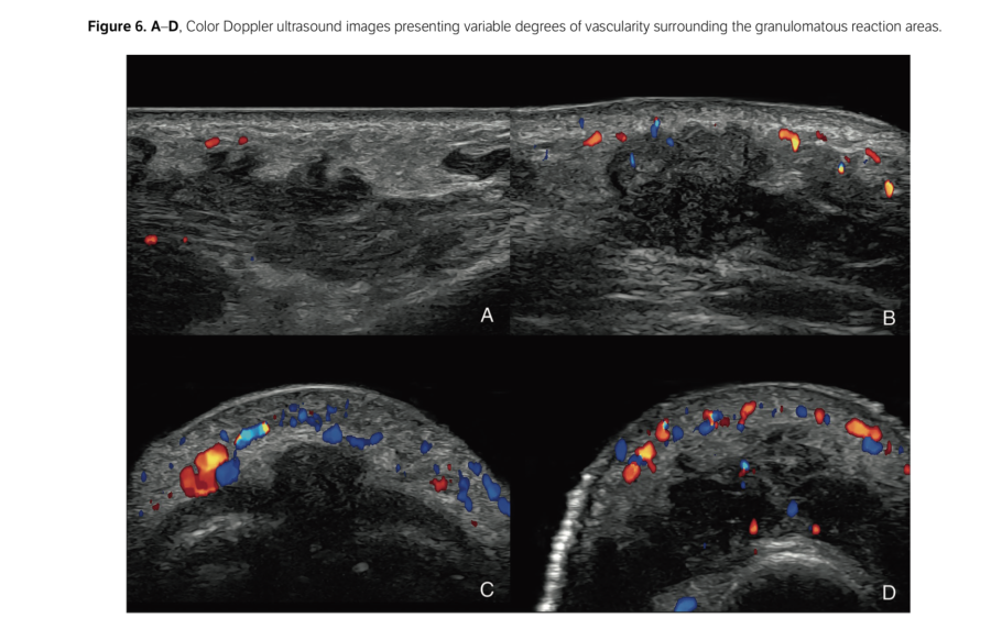 Wortsman et al considerano la necessità di esami ecografici standardizzati durante la comparsa di queste formazioni. Questa tecnica di imaging può aiutare a distinguere se una protuberanza o un gonfiore siano dovuti a un riempimento eccessivo o, addirittura, a una reazione granulomatosa; pertanto, l'ecografia può supportare la gestione e il follow-up di questi casi in modo più accurato. In conclusione, l'ecografia può fornire informazioni anatomiche preziose e dettagliate a supporto della diagnosi e della gestione, nonché preziose informazioni sulle reazioni granulomatose ai filler cosmetici.